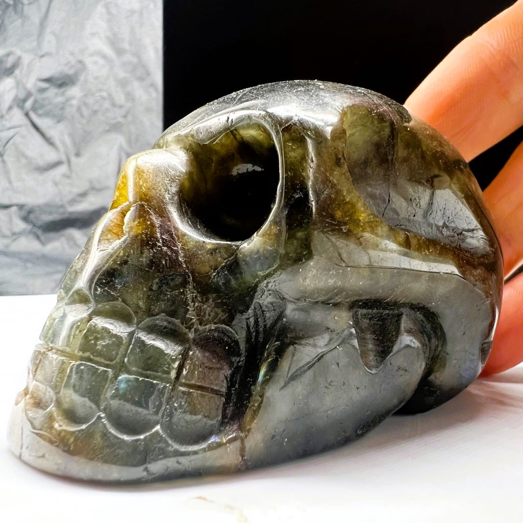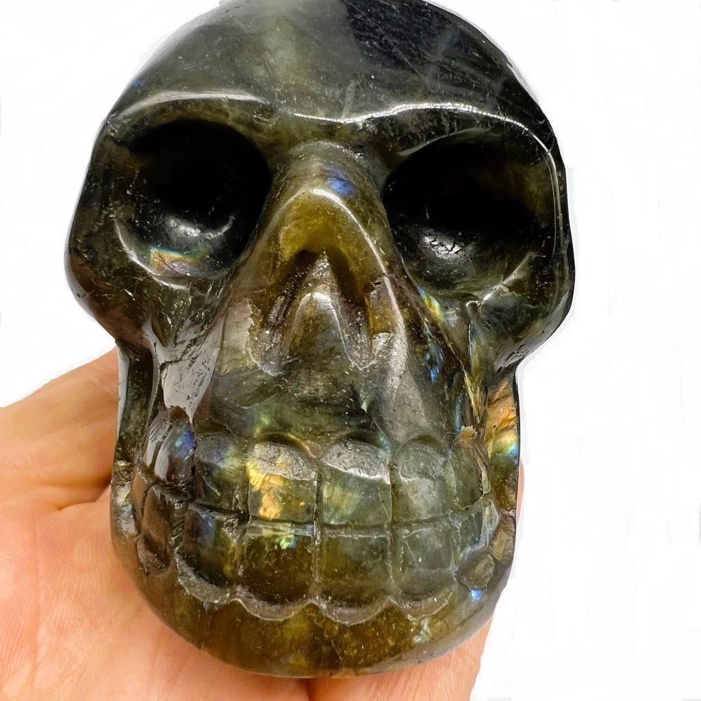 This Labradorite skull is a stone of power, strength and magic. Spurring the ascension process, expanding one’s consciousness it certainly is a stone for those seeking an ally that supports their spiritual journey. It brings protection, deflecting unwanted energies from your auric field, removing hooks and other people’s projections including thought forms from your aura. Active in denying entry prevents possible energy leakage by providing a shield that prevents sources from tapping in and draining your life force.